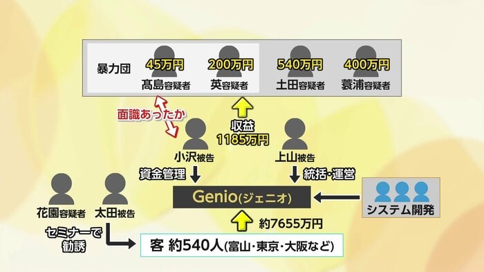 事件を巡っては、「Genio」と称する架空の暗号資産投資への出資を募っていたとして、富山市の会社役員小沢淳被告(46)など7人が逮捕され、そのうち、資金を管理していた小沢被告、事業全体を統括していた上山哲平被告(41)、それに、投資に関する対面のセミナーを企画・運営していた太田善宏被告(66)が起訴されています。