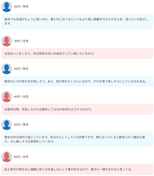 冬からの気温変化を合図に、「この季節を待ってたんだ!」と言わんばかりに動きが軽くなるワンちゃんが多いことも、コメントから感じられました。