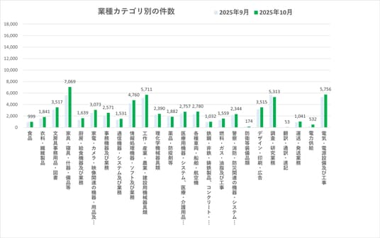 2025年10月の業種別入札件数では、物品・機器関連を中心に増加が見られました。「家具・寝具・什器・備品等」は7,069件(前月比125.8%)、「家電・カメラ・映像関連の機器・用品及び業務」は3,073件(前月比121.6%)、「情報処理機器・ソフト及び業務」は4,760件(前月比112.6%)と伸びを示し、物品と情報関連分野が全体の増加を牽引しました。