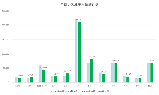 2025年10月の入札予定情報件数は68,700件でした。前月(15,295件)から53,405件の増加(前月比449%)となり、大きく増加しました。前年同月(2024年10月:68,448件)との比較では252件の増加(前年同月比100.4%)で、前年とほぼ同じ水準となっています。