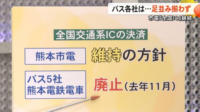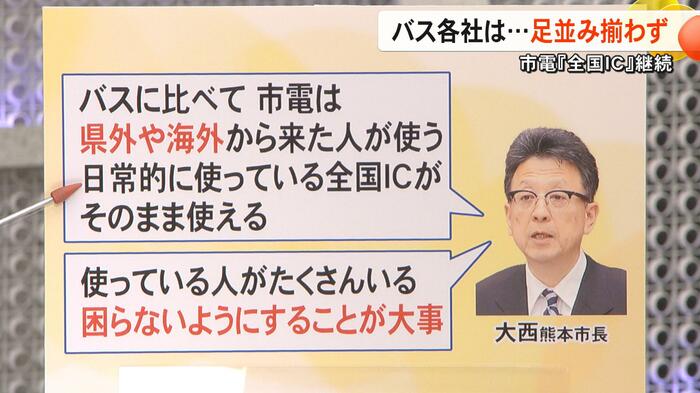 決済方法をめぐり県内の公共交通機関で、足並みが揃わない形となる。大西熊本市長はこれについて、「バスに比べて、熊本市電は県外や海外から来た人が多く使うことが統計でわかっている。日常的に使っている全国交通系ICがそのまま使える」、そして「まだ使っている人がたくさんいる。そういう人が困らないようにすることが大事」と述べた。