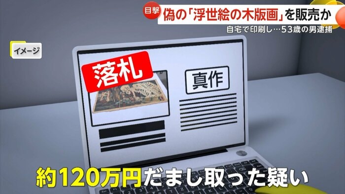 偽物の浮世絵の木版画を、本物と偽って売りさばいた疑いで逮捕された。