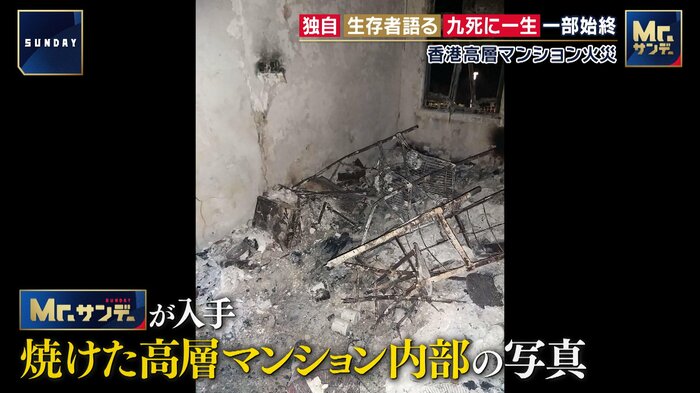 Mr.サンデーが入手したのは、焼き尽くされた高層マンションの室内で撮影された写真。椅子や、棚のような物の残骸が横たわり…窓枠は大きくねじ曲がっている。