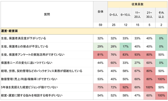 1.同様、生徒数が多くなるにつれ、バックオフィス業務の煩雑化や数値管理が課題として現れている結果となりました。一方で、「保護者ニーズの変化に追いつけていない」が生徒数30名以下の教室において最多となりました。