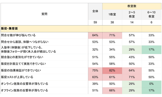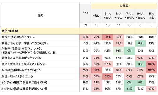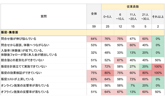 「入塾率~続出している」「販促を計画立てて実施できていない」「オンライン施策の反響率が落ちている」といった項目について、従業員数が多いほど回答割合が低い結果となりました。