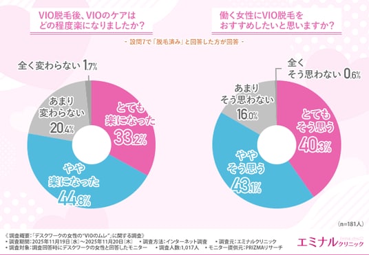 さらに、「VIO脱毛後、VIOのケアはどの程度楽になりましたか?」と質問したところ、約8割が『とても楽になった(33.2%)』『やや楽になった(44.8%)』と回答しました。