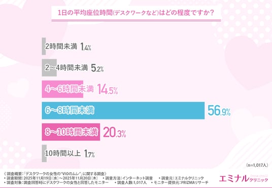 はじめに、「1日の平均座位時間(デスクワークなど)はどの程度ですか?」と質問したところ、以下のような回答結果になりました。