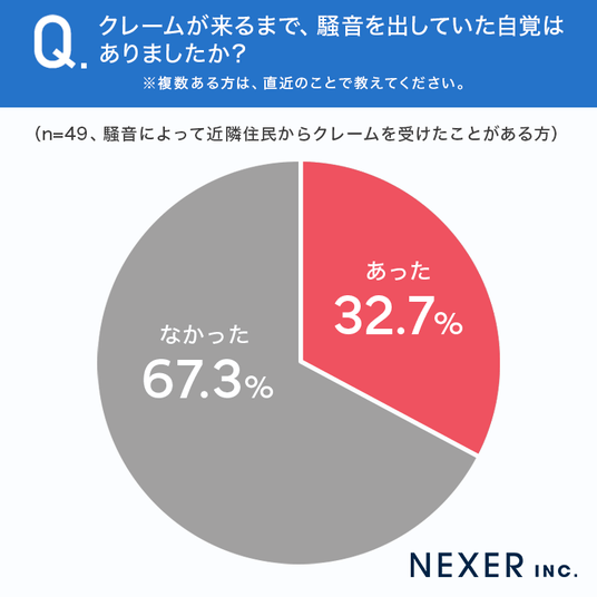 クレームを受けた人のうち、67.3%が騒音を出していた自覚がなかったと回答しており、自覚があった人は32.7%に留まります。