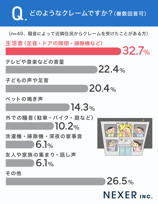 クレームの内容は、「生活音(足音・ドアの開閉など)」が32.7%と最多で、次いで「テレビや音楽」が22.4%、「子どもの声や足音」が20.4%と続きました。
