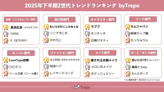 今回は、10代~20代の女性(Trepo girls)※を対象に「芸能・インフルエンサー」「流行語」「キャラクター」「フード」「モノコト」「ファッション」「メイク」「ポーズ・ダンス」の8部門に分け、2025年下半期のZ世代トレンドをランキング化しました。