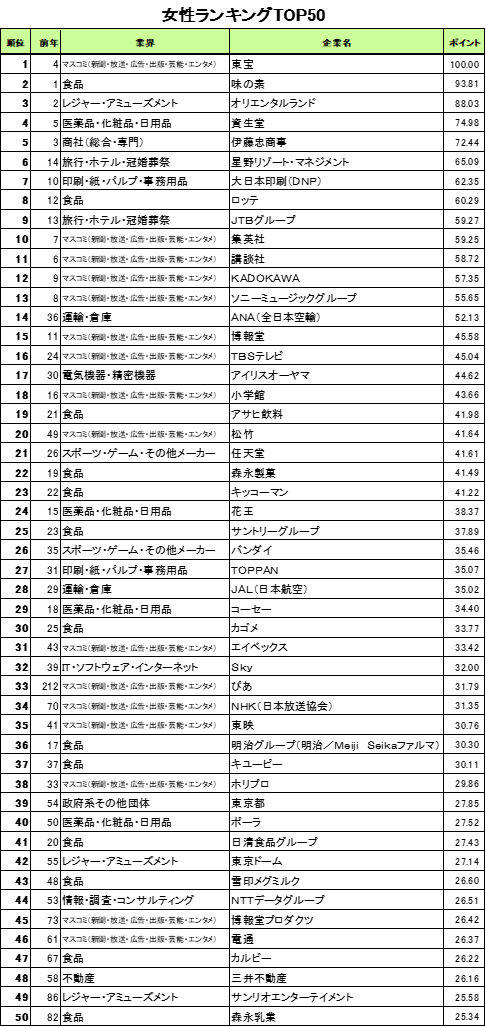 (2)女性部門トップは東宝。トップ50のうち「マスコミ」が16社占める。「食品」は13社、旅行も人気戻る