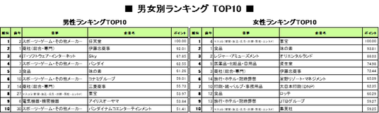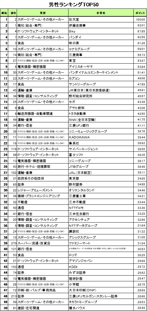 (1)男性部門は任天堂が伊藤忠押さえてトップ。ゲーム大手が上位に。金融業界はトップ50に6社入り復活