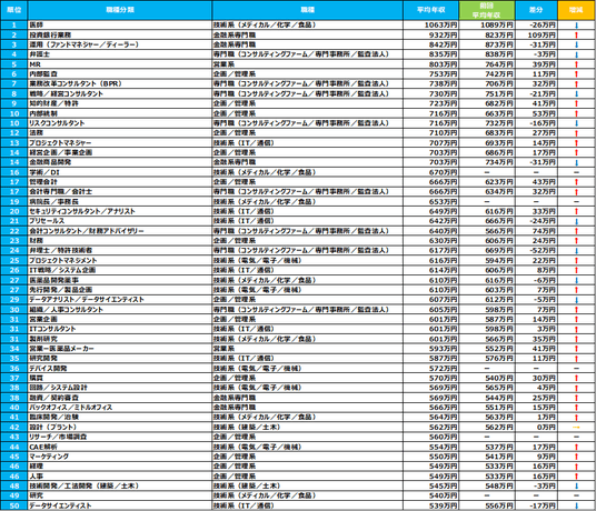 職種別:1位は3年連続「医師」で1,063万円。職種分類ではトップ10のうち、「専門職(コンサルティングファーム/専門事務所/監査法人)」の分類が4つを占める