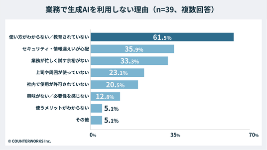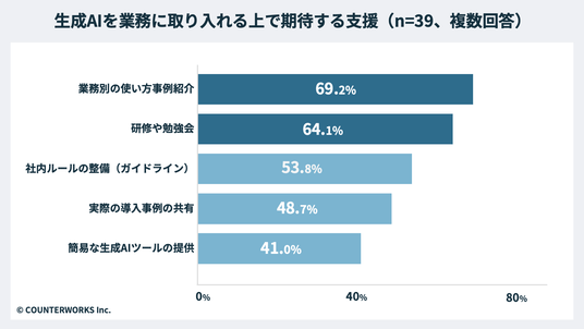 今回の調査では、生成AIをまだ業務で使ったことがない未利用者も25%存在しました。未利用の理由としては、「使い方がわからない/教育されてない」「セキュリティリスク・情報漏えいが心配」が上位を占めています。一方で、未利用層のうち6割超が「業務別の使い方事例紹介」や「研修や勉強会」など、導入支援を求めていることも明らかになりました。この結果から、ツール理解よりも「どう安全に使うか」を学ぶ機会の不足が障壁になっていることがわかります。今後は、“安心して試せる環境”を整えることが利用拡大の第一歩となりそうです。
