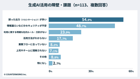 - 主な課題・障壁は「誤った出力(ハルシネーション)」(54.9%)が最も多く、次いで「セキュリティ不安」(48.7%)、「社内ルール不在」(23.9%)。