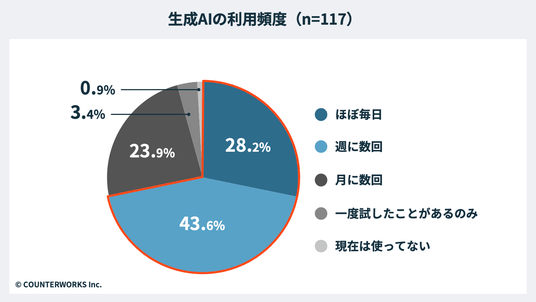 - 4人に3人が業務での利用経験あり。 そのうち日常利用は約7割。- 活用の定着度は「必要時のみ活用」が約8割、 「業務フローに恒常に組み込む」はわずか3.4%にとどまる。