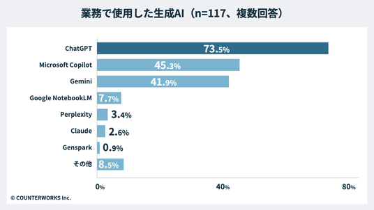 - 主に使われているツールは第1位「ChatGPT」(73.5%)、第2位「Microsoft Copilot」(45.3%)、第3位「Gemini」(41.9%)。