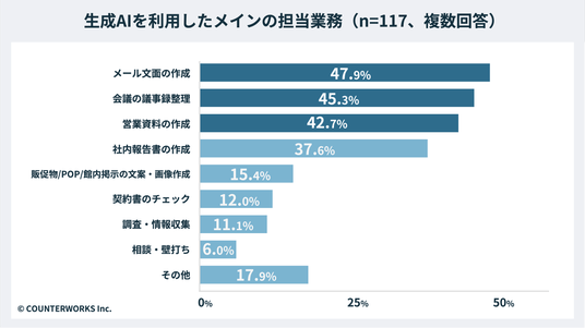 商業不動産をデジタル化し新たなインフラの創造を目指す株式会社COUNTERWORKS(本社:東京都港区、代表取締役CEO:三瓶 直樹、以下「カウンターワークス」)は、一般社団法人日本ショッピングセンター協会(本部:東京都文京区、会長:菰田 正信)が発行する月刊ショッピングセンター(以下、「SC」)専門誌『SC JAPAN TODAY(エスシー・ジャパン・トゥデイ)』と共同で、全国のSC等商業施設事業者の従業員95社156人を対象に「商業施設事業者における業務での生成AI活用の実態調査」を実施しました。