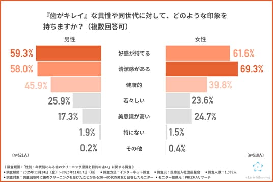 20~30代は「見た目の清潔感」、50~60代は「健康維持」を重視 他者の歯の印象、女性は「清潔感」男性は「好感度」と、性別で異なる意識が判明