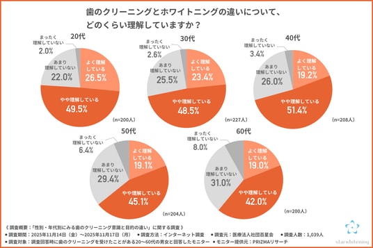 「歯のクリーニングとホワイトニングの違いについてどれくらい理解しているか」について尋ねたところ、年代別で以下のような結果になりました。