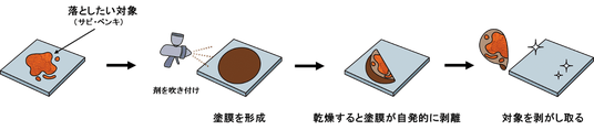 開発した剥離除去技術を用い、さまざまな素材に付着した汚れに対する性能を評価しました*1。その結果、鋼板のサビ(動画1)、ステンレス板の水性ペイント(動画2)を除去可能であることを確認。さらに、コンクリート表面では、表層を数十~数百μmの深さで除去できることもわかりました(動画3)。また、いずれの評価においても塗膜は対象物を閉じ込めて自己剥離しました。*1 モデル汚れを作成し、剥離除去技術を用いた剤を塗布後約6時間乾燥(20~25℃/25~35%RH)