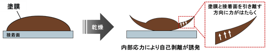 塗膜を自己剥離させる鍵は“内部応力”です。内部応力とは、乾燥などによって塗膜が縮む際に生じる力のことで、塗膜と接着面を引き離す方向にはたらき、自己剥離を誘発します(図2)。