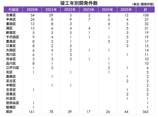 2020年以降の開発件数を竣工年別に見ると、東京オリンピックが開催予定だった2020年の件数が161件でピークを迎えています。その後コロナ禍によって開発計画自体が大きく減少したことから、2022年、2023年、2024年に竣工する物件が大きく減少しました。2023年以降は徐々に竣工予定の物件が増加し、2025年は44件が竣工予定となっており、開発件数は回復基調にあります。