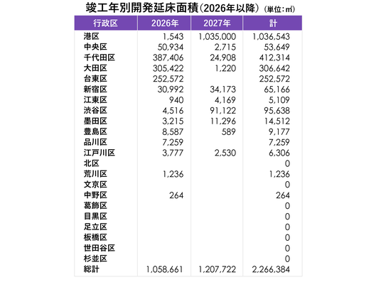 2026年以降に竣工する物件の延べ床面積を見ると、2026年、2027年ともに年間100万平方メートル を超え、前述の2020年を上回る規模の物件が竣工することが分かります。開発エリアは2025年以前と同様都心部が上位を占めており、再開発など大規模複合開発にホテルが含まれるケースが多いことが面積を引き上げる要因になっています。最も延べ床面積が広い千代田区では、2027年に大手町や内幸町でホテルが含まれる大規模な再開発が竣工する予定になっており、面積を押し上げる要因になっています。