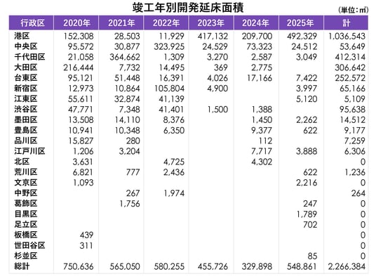 一方で、前述の開発件数で上位だった台東区や墨田区は延床面積では上位になっていません。エリアによって開発されるホテルの規模感が大きく異なることが分かります。