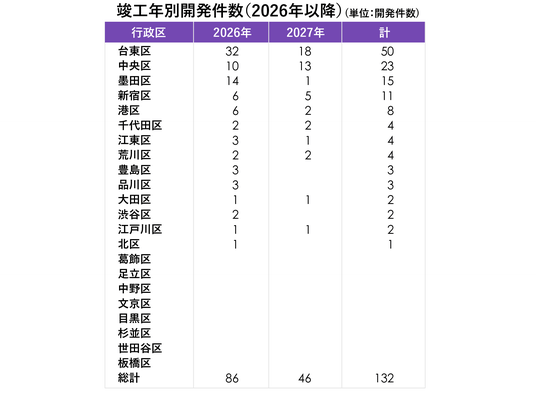 続いて、2026年以降の竣工件数を見ると、来年2026年は86件が竣工を予定しており、2020年以降の供給件数のピークを迎えます。エリア別に見ると今年までと同様、台東区、中央区、墨田区が上位を占めており、上位エリアの供給が衰えていないことが分かります。