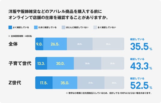 「洋服や服飾雑貨などのアパレル商品を購入する前にオンラインで店舗の在庫確認をすることがありますか?」という質問に対し、「確認する」と回答した人は全体で35.5%と、約3人に1人が事前に店舗在庫の確認をすることが分かりました。年代別では20代以下の女性が57.5%で最も高く、次いで30代男性が53.8%となりました。世代別では、子育て世代(中学生以下の子どもを持つ親・男女)の43.3%、Z世代(高校生・大学生の男女)の52.5%が「確認する」と回答しました。さらに、事前にオンラインで在庫確認をする人の内「オンラインで在庫確認をした後、店舗で商品を購入した経験がある人」は全体で58.1%と6割近くおり、中でも子育て世代の男性30代が最も高い78.9%という結果となりました。