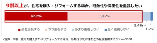 9割以上の人が、今後、住宅を購入またはリフォームする場合、断熱性や気密性を重視したいと思っている。