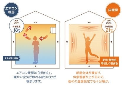 床暖房の快適さの秘密は、「ふく射熱(遠赤外線)式」と呼ばれる暖め方。床だけでなく、壁や天井にも熱を伝え、そこから出るふく射熱が部屋全体と身体をムラなく暖めるため、身体の芯までぽかぽかに。床暖房は、頭部と足先の温度差が極めて小さく、エアコン暖房に比べ健康的です。