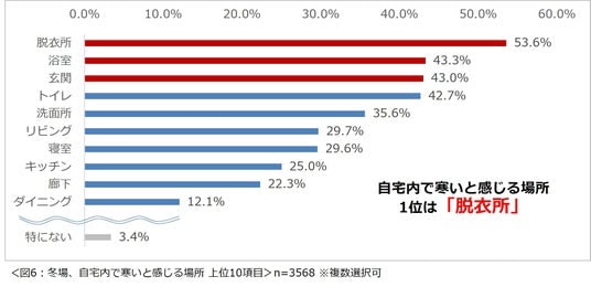「冬場、自宅内で寒いと感じる場所はどこですか?」と尋ねたところ、1位「脱衣所」(53.6%)、2位「浴室」(43.3%)、3位「玄関」(43.0%)という結果になりました。(図6)