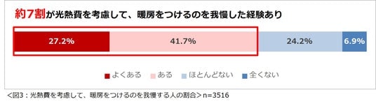 約7割の人が、光熱費を考慮して、暖房をつけるのを我慢することがある。