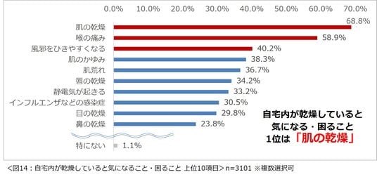 自宅内の乾燥が気になるという3101名に、自宅内が乾燥していると気になること・困ることについて尋ねたところ、1位「肌の乾燥」(68.8%)、2位「喉の痛み」(58.9%)、3位「風邪をひきやすくなる」(40.2%)という結果になりました。(図14)