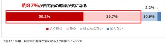 自宅の乾燥が気になる人は約9割。乾燥が原因で「肌の乾燥」「喉の痛み」など健康面の不安も。