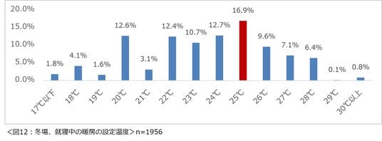 就寝中に寝室で暖房器具を使用しているという1956名に、「冬場、就寝中は暖房を何度に設定することが多いですか?」と尋ねたところ、最も多かった回答は「25℃」で16.9%という結果になりました。(図12)
