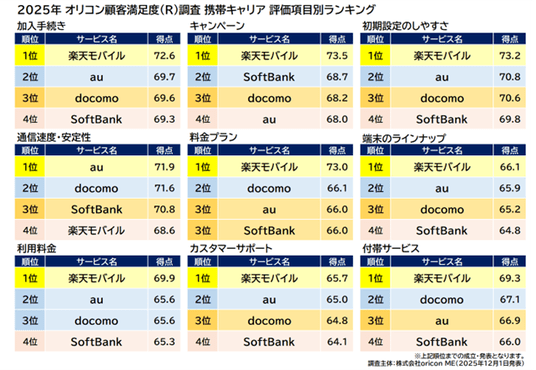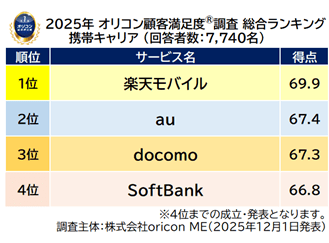 オリコン株式会社(本社:東京都港区 代表取締役社長:小池 恒、略称:オリコン)は、グループ会社である株式会社oricon MEが、実際のサービス利用者を対象に第三者の立場で実施した『携帯キャリア』の顧客満足度調査の結果を、2025年12月1日(月)14時に「オリコン顧客満足度(R)」公式サイト内にて発表いたしました。