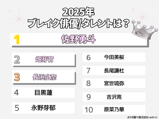 1位にはM!LKの「佐野勇斗」が選ばれ、今季のドラマ出演もあり、女子高生から高い注目を集めています。続いて、10代を中心に人気の女優「畑芽育」がランクインし、同世代からの支持の高さがうかがえます。注目すべきは、「長浜広奈」が3位に入ったことで、俳優ではないものの、バラエティ番組やCMへの出演が増え、女子高生の間でインフルエンサーからタレントへと認知が広がっている様子が見て取れます。