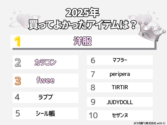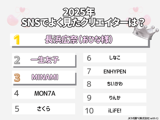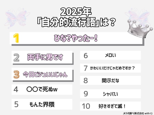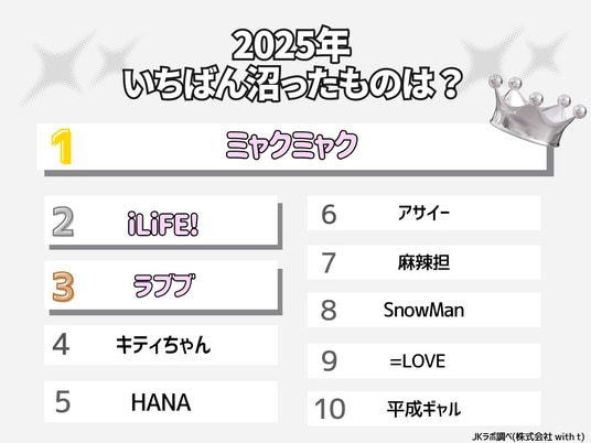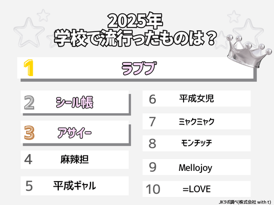 ティーン向けエンタテイメント事業を展開する株式会社with t(本社:東京都渋谷区、代表取締役社長:宮城啓太)が運営する、女子高生の「最新トレンド」を発信・分析するシンクタンク兼メディアである「女子高生ラボ」は、全国の現役女子高生100名を対象に「女子高生の年間トレンド調査」を実施し、2025年に現役女子高生の間で流行したトレンドランキングを発表しました。