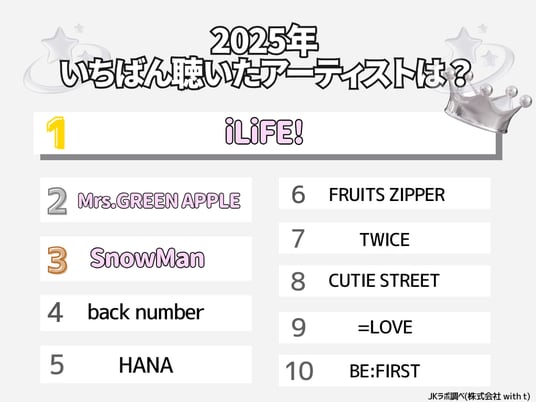 1位に「iLiFE!」が輝き、TikTokでバズった楽曲を中心に10代から注目を集めた。2位は幅広い世代から人気の「Mrs. GREEN APPLE」、3位は安定した人気を誇るアイドルグループ「SnowMan」です。さらに「HANA」や「FRUITS ZIPPER」のランクインからは、若い世代を中心に新進アーティストへの支持の広がりも感じられる。