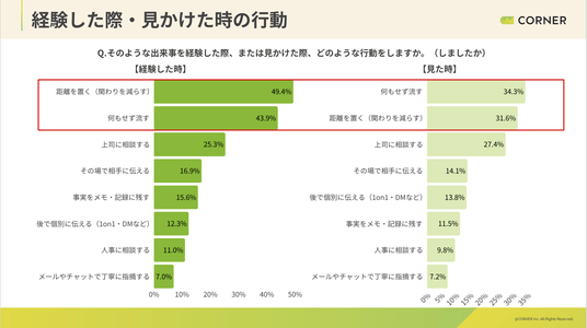 「波風を立てずに距離を取る」傾向が共に強い。経験した際の上司への相談やその場でのフィードバックなどの行動は2~3割にとどまり、見かけた時は割合がやや高くなるものの、その場で伝える・記録に残すなどの行動は1~2割にとどまる。こうした行動の傾向により、組織としては表面化しづらいリスクと言える。