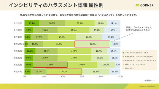 ・全体の半数がインシビリティを「ハラスメントに該当し得る」と認識する一方、「明確にハラスメント」と判断する層は22%に留まり、半数以上が“グレーゾーン”として捉えている。