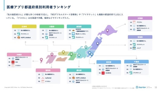 医療アプリの利用者数を都道府県別に見ると、「私の歯医者さん」が最も多くの地域で1位にランクイン。「M3デジカルスマート診察券」や「アイチケット」も複数の都道府県で上位に入っています。「ナスカレ」は北海道や沖縄、福岡などでランクインしました。