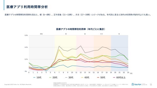 医療アプリの時間帯別利用率を見ると、朝と正午前後と夕方に利用のピークがあります。年代別に見ると30代の利用率が他年代よりも高い傾向があります。