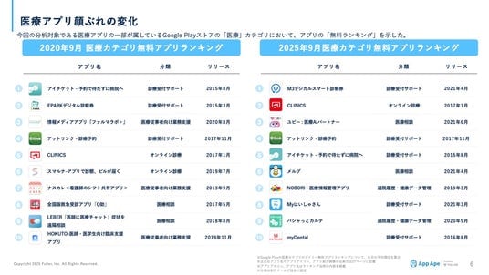 2020年と2025年のGoogle Playの医療カテゴリ無料アプリランキングを比較すると、上位アプリの顔ぶれが変化していることが分かります。2020年は診療受付サポートが中心でしたが、2025年はオンライン診療や医療相談、健康データ管理など対象領域が広がっています。AI活用アプリも登場しており、医療アプリはより多様なニーズに応える方向へシフトしていることがうかがえます。