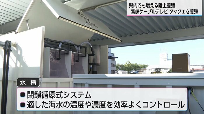 「陸上養殖」が行われるのは、宮崎ケーブルテレビの敷地内にある駐車場の一角に設置された水槽。天候に左右されることもなく、安定して養殖が行える。