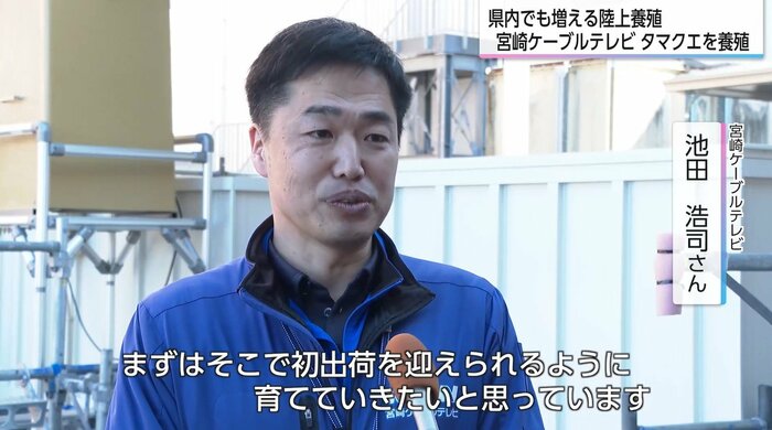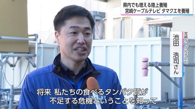 宮崎ケーブルテレビの池田浩司さんは、陸上養殖事業開始の背景について「日本の漁獲量が激減していることと、将来、我々の食べるタンパク質が不足する危機を知り、小規模の循環式装置であれば当社にもできるのではと思い、トライアルで開始した」と説明した。