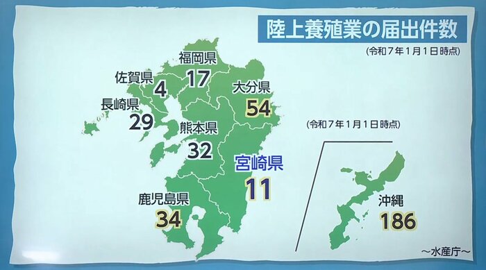 陸上養殖を行っている数を都道府県別で見ると、沖縄県が最も多く186件。次いで大分県が54件、鹿児島県が34件となっていて、九州で盛んに行われている。宮崎県内でもヒラメやトラフグ、クルマエビ、アワビなど11件、陸上養殖が行われている。